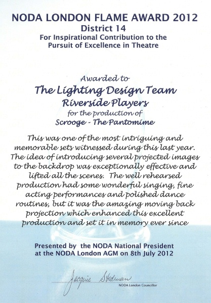 We are very pleased to announce that we won the NODA London Flame Award 2012 for District 14. This was awarded to the Lighting Design Team for our production of Scrooge, the Pantomime. Once again, congratulations to everyone involved.